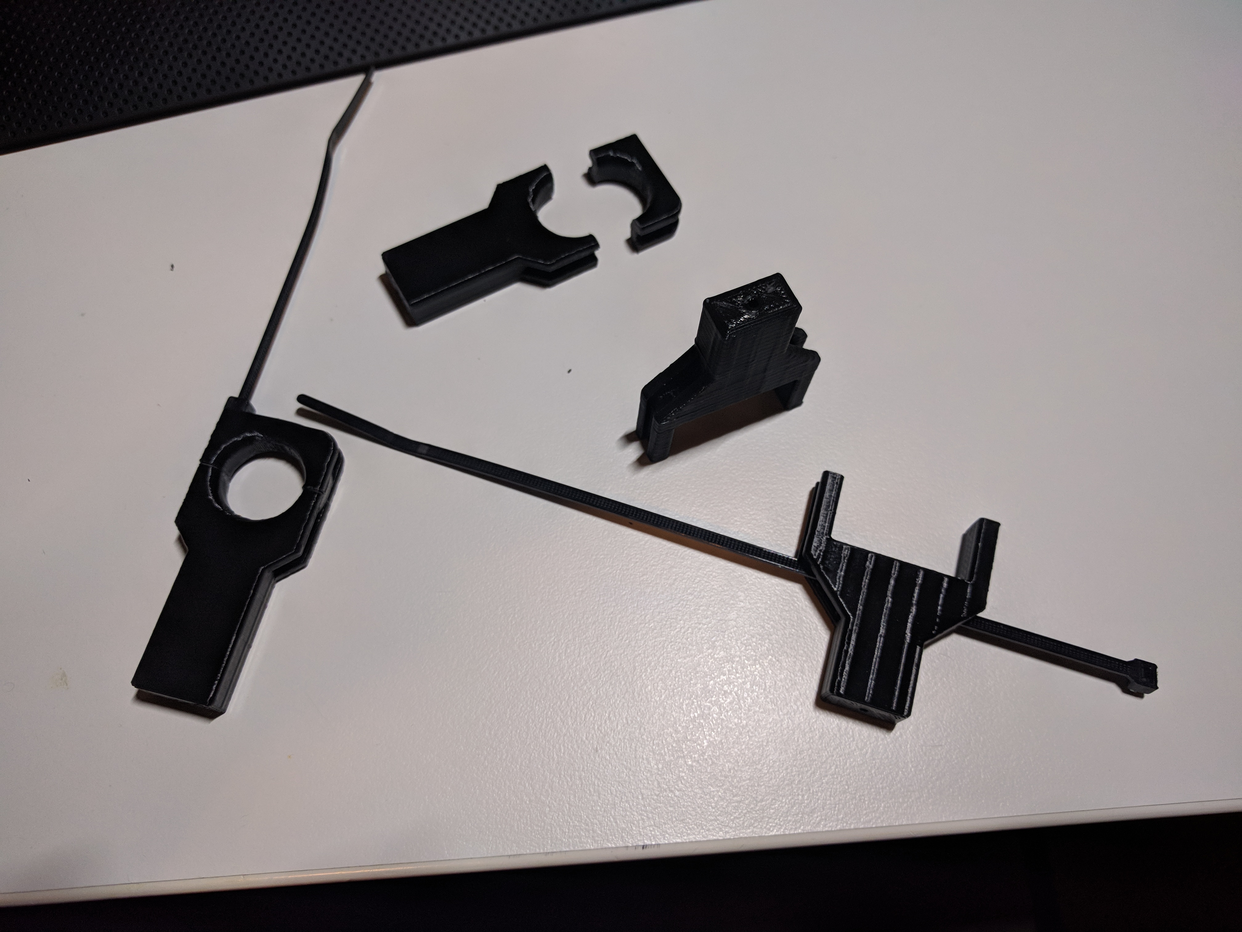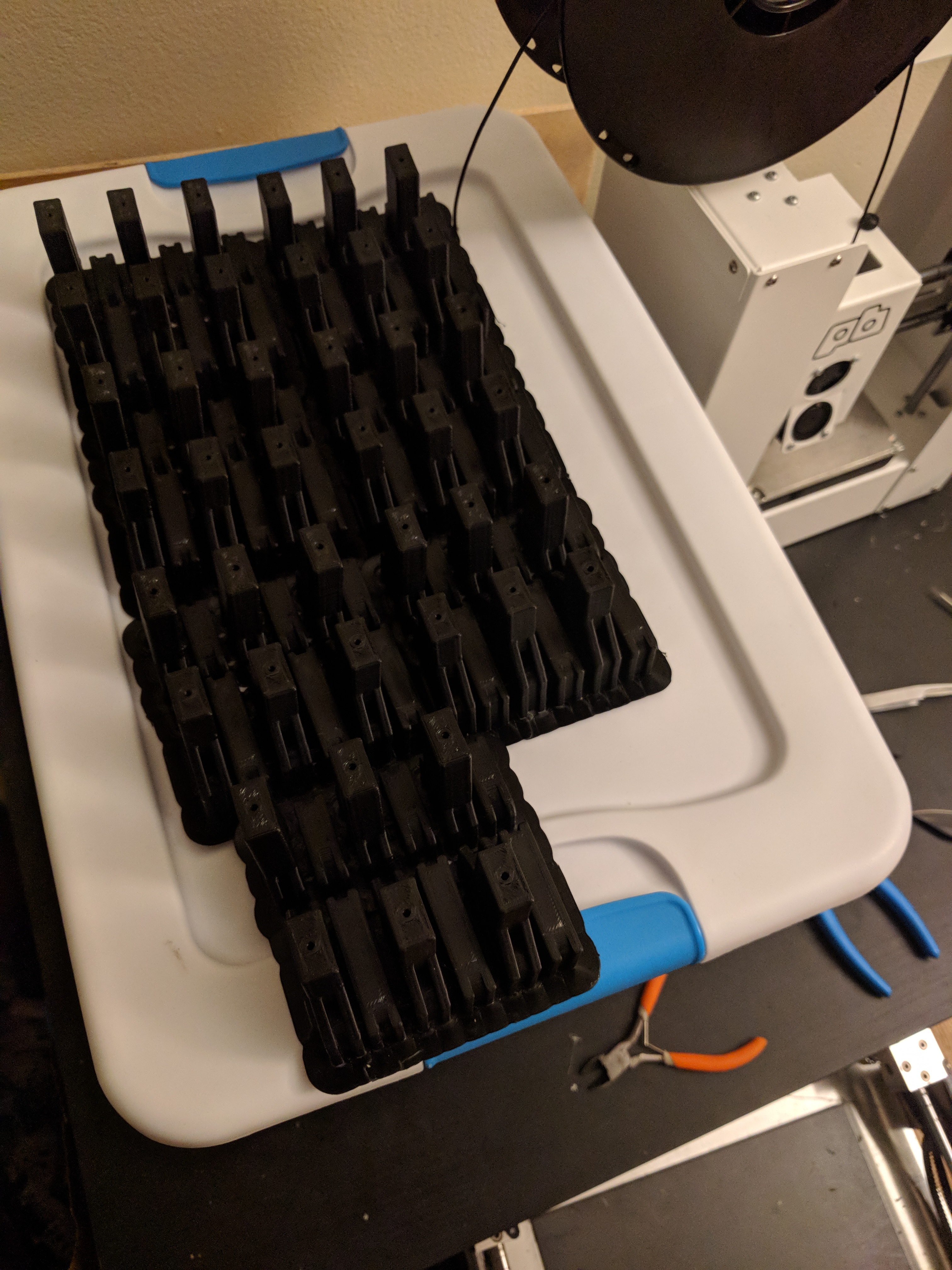 Production of the 3D printed brackets ended up being a significant challenge due to the massive quantity of parts. I grouped the parts such that I got 3 upper and 3 lower mounts per print, meaning I needed a total of 14 prints to get the parts required to mount 40 LED strips. These were all printed on a heavily used printrbot play. It originally did not work and was sold to me "as-is" and "only good for parts." I stripped it down to parts and built it back up with some attention to detail. I used proper cable sleeving to protect the wiring and it worked fine once reassembled. I replaced the bed with 1/4" aluminum plate because the original 1/8" bed was warped. I suspect the previous owner didn't quite assemble it properly and was plagued by adhesion issues stemming from the warped bed. I just need a thin layer of PVA based glue-stick applied to the bed to get perfect adhesion (sometimes too good) even without elevated bed or chamber temperatures. These prints and another equally massive printing project ended up wearing out the extruder gear and a cooling fan.