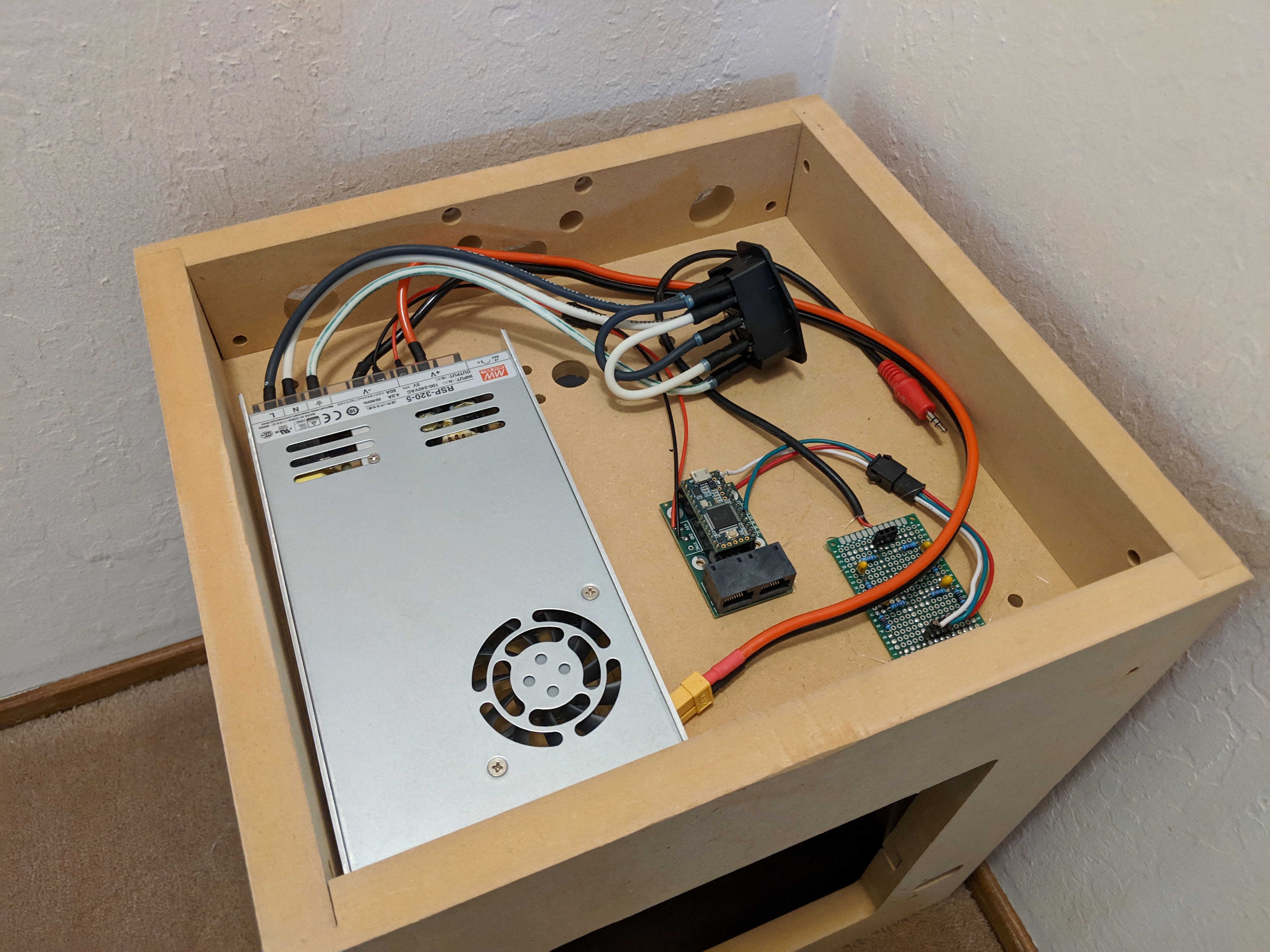 The electronics were mounted in the frame from a 3D printer I had designed but never finished making. I used a slightly higher end power supply than the one in my wall mounted visualizer (supposedly UL rated). The wall power is fused with a power switch. RJ45 connectors were used for the signal lines, and an XT60 was used for the power backbone. This makes it possible to quickly disconnect the electronics for storage. The final visualizer turned out very well. The visualizer was animated using the same code from my wall visualizer with a few modifications. First, there is no left/right channel mirroring in this visualizer. Lower frequencies are at the base of the staircase and higher frequenncies are at the top. An additional animation was added (used for a Christmas party) where icicles would grow and drop pieces depending on the amplitude at each frequency. I plan to add more animations for other events (fireworks / countdown for new years).
