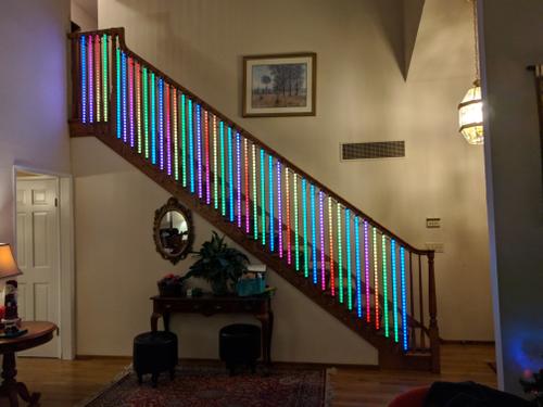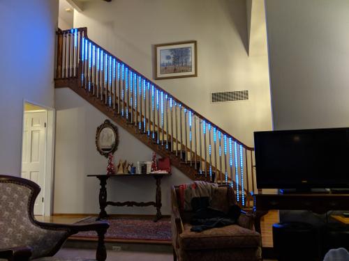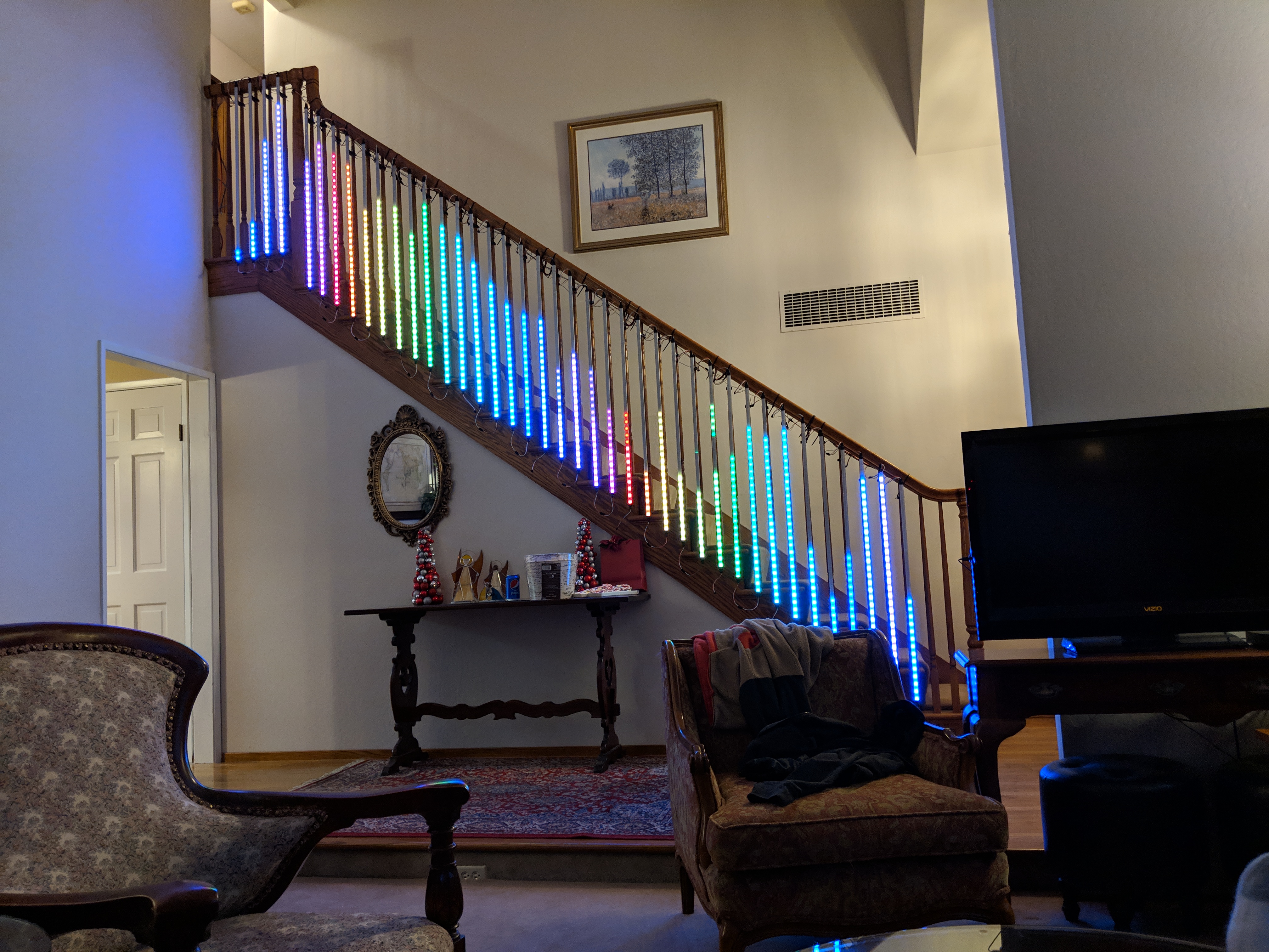 I'm a fan of the phrase "go big or go home" but in this case it became "go home and go big." I was home for the holidays and holding a party. I couldn't bring my new wall visualizer, so I decided to make a new adaptation of it. My original thought was to replace the lights in a Christmas tree with strips of WS2812b LEDs, but I couldn't think of a good way to animate it to react to music. After looking for other places to mount the lights, I figured the best place to put the strips was on the balusters (vertical posts) of the staircase.