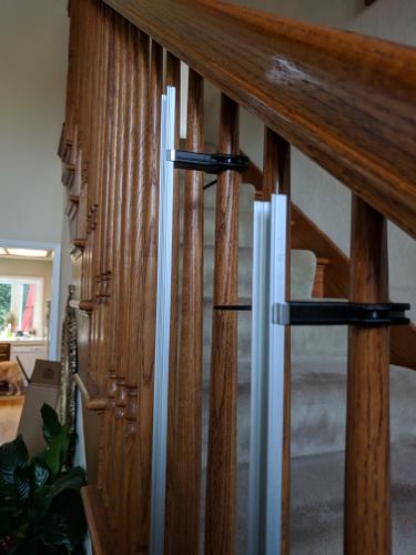 Test fit of aluminum extrusion to the staircase. The 3D printed mounting blocks interface the extrusion brackets to the staircase balusters.