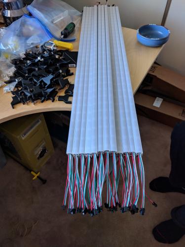 Once again production due to the quantity of components ended up being a significant challenge. Thankfully I have good friends who came over to help with assembly. All of the 3D printed brackets needed metal mounting brackets bolted in place. The LED light bar assembly was surprisingly difficult in large quantity. First, the extrusion needed to be covered in kapton tape. This tape layer ensures that the LED strips can't short to the aluminum. Second, the LED strips had to be adhered to the extrusion (on top of the applied kapton tape). The LED strips come in 5M long rolls. Each roll is built from 10 1/2M segments soldered together. These rolls had to be disassembled into 1M segments before assembling into the aluminum extrusion. Third, connectors needed to be attached to each end of the LED strip. Female connectors were used for the outputs, while male connectors were used for the inputs. Female connections were chose for the outputs because there are always some exposed connections in the array, and the female connectors are harder (nearly impossible) to accidentally short. Finally, a diffuser (came with the aluminum extrusion) was snapped into place. Aside from diffusing the light and hiding the LEDs, the diffuser also acts to protect the LEDs from damage.
