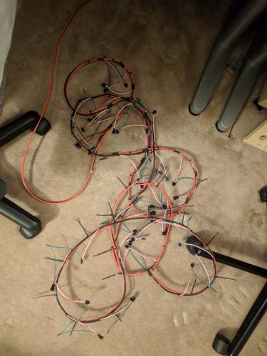 Power requirements were a major concern just like the wall mounted visualizer. Every bar has its own connection to a power backbone, which uses thick wire to minimize voltage drop under high current draw. Each LED can draw a maximum current of 60mA. The array consists of 40 bars with 30 LEDs each. This leads to a peak possible current draw of over 70A! This visualizer also uses a Teensy micro controller like my wall visualizer (same code too). The Teensy can support up to 8 channels of WS2812b LEDs, so the visualizer was split into 8 groups of 5 LED bars. A separate set of wires is run to each group of LEDs directly from the Teensy. Running each group in parallel helps to increase data rate and therefore the maximum frame rate of the visualizer. Each channel only needs to drive 150 LEDs, so an 8x increase in frame rate compared to driving all of the LEDs from one channel.