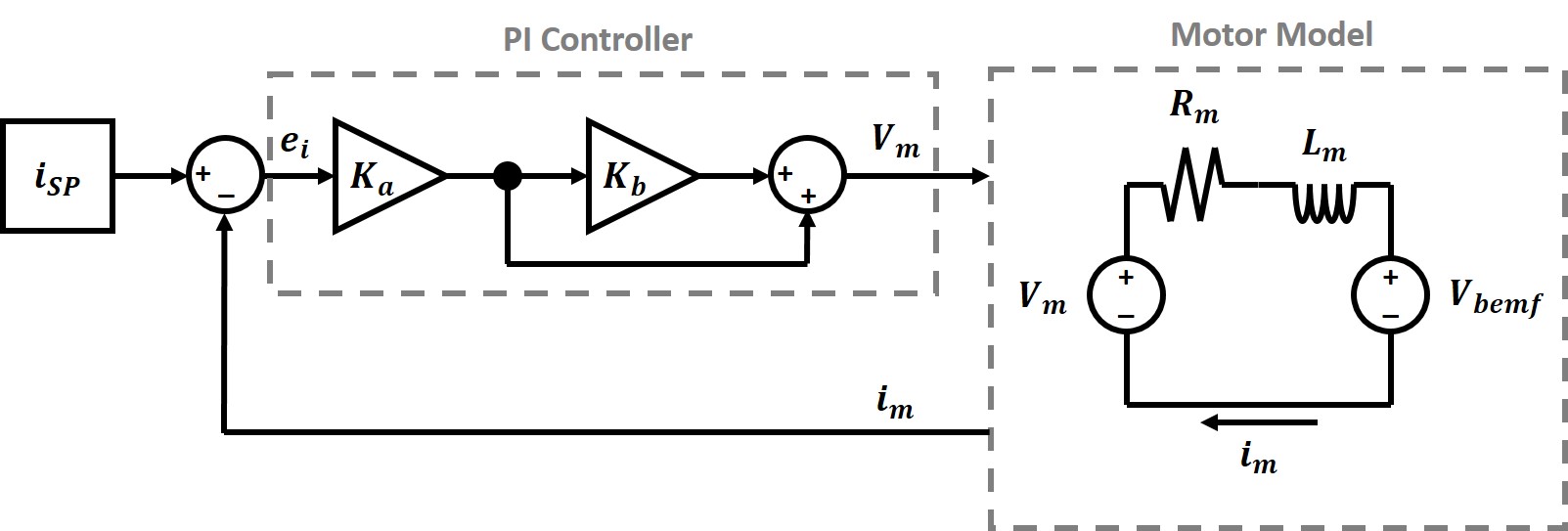 Figure 1. Block diagram for a cascaded PI controller. Output from the PI controller is voltage powering the motor, while feedback is the current measured from the motor coil.