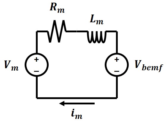 Let's start with the electrical portion of a motor. An electric motor can be drawn as a simplified circuit containing two voltage supplies, an inductor, and a resistor (Fig. 1). The first voltage source labeled as \(V_m\) is the input voltage from an external source. This external soruce could be a battery, power supply, motor controller, or even another motor. The inductor and resistor labeled as \(L_m\) and \(R_m\) model the electromagnetic coils in the motor. The second voltage source labeled as \(V_bemf\) represents the voltage generated by the motor when spinning. All motors can function as generators. A voltage is generated on a coil of wire when a coil of wire is subject to a changing magnetic field (the magnet in a motor sweeping by the coil). For now we can write an equation that relates the input voltage \(V_m\) to the current in the coil \(i_m\), but we will need to expand out the \(V_{bemf}\) term to model the motion of the motor. \[V_m = R_m i_m + L_m \dot{i_m} + V_{bemf} \tag{1}\]