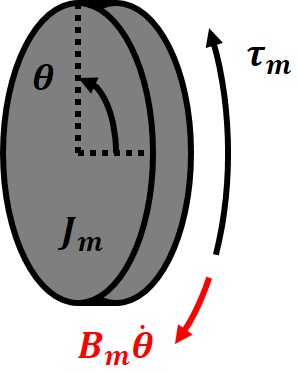 The mechanical model of the motor can be drawn as a rotating mass with an applied torque (Fig. 2). The rotational inertia of the motor is \(J_m\), while the input torque is \(\tau_m\). An additional damping term \(B_m\) is included to account for friction. This term simulates viscous damping that is proportional to rotational velocity, rather than friction which may be constant or non-linear. The equation of motion for the motor relates input torque to angular acceleration \(\ddot{\theta}\). \[\tau_m = J_m \ddot{\theta} + B_m \dot{\theta} \tag{2}\] Notice that angle (\(\theta\)) does not appear in the equation of motion. Torque on the motor will create acceleration (\(\ddot{\theta}\)), so the position is irrelevant for this model.